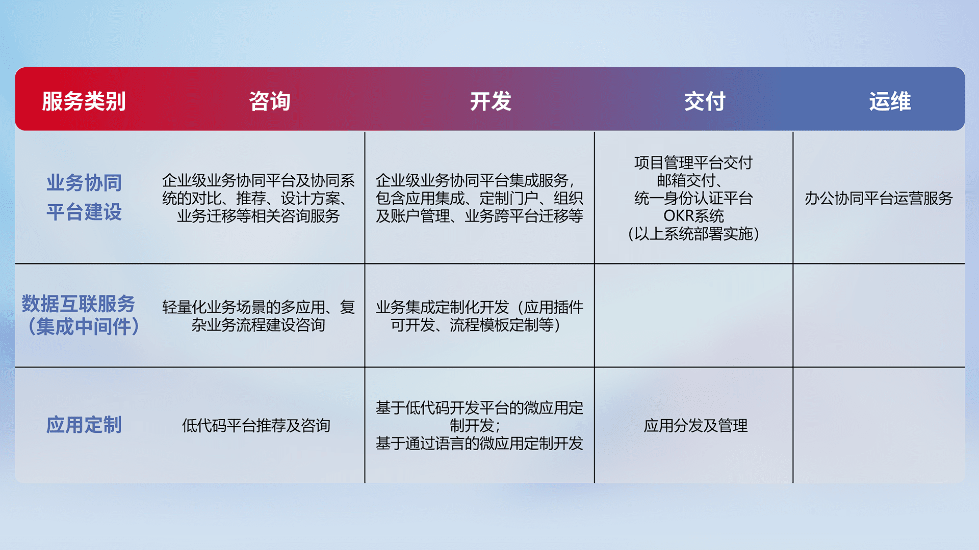 针对钉钉、、、、企微、、IDaas等平台级产品提供产品的规划、、、方案、、、、交付、、、、定制化开发等服务,,,实现如统一协同办公、、、、智能客户服务、、、、混合会议管理、、智能数据查询、、、、等业务场景,,,实现数字化转型。。。